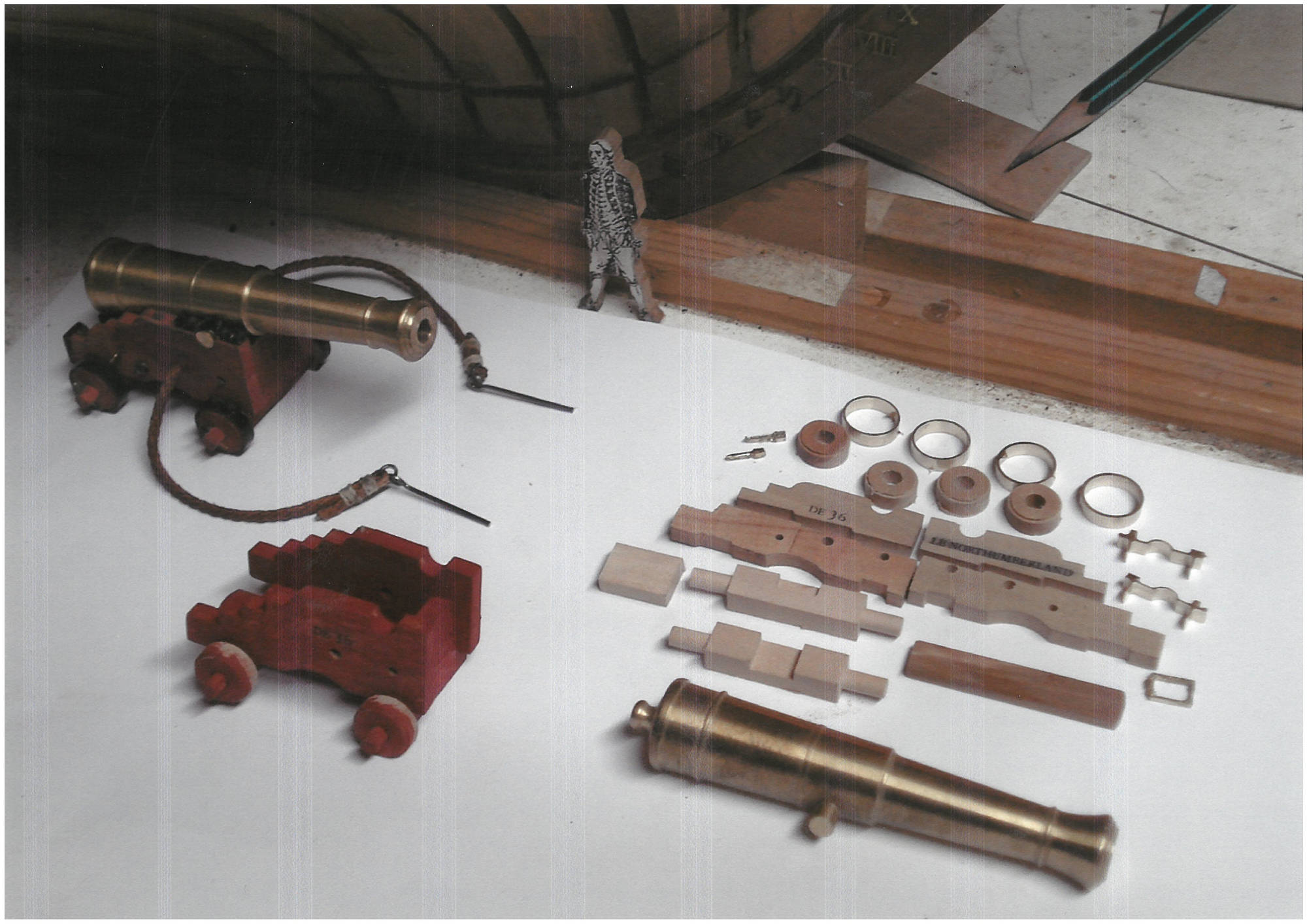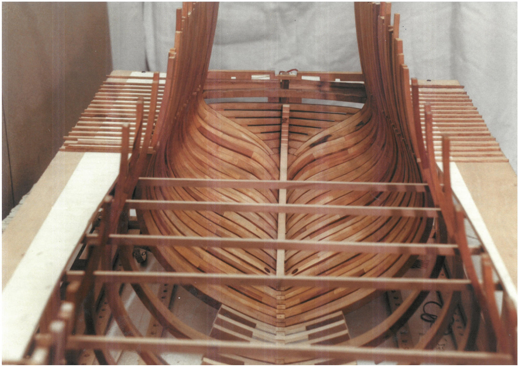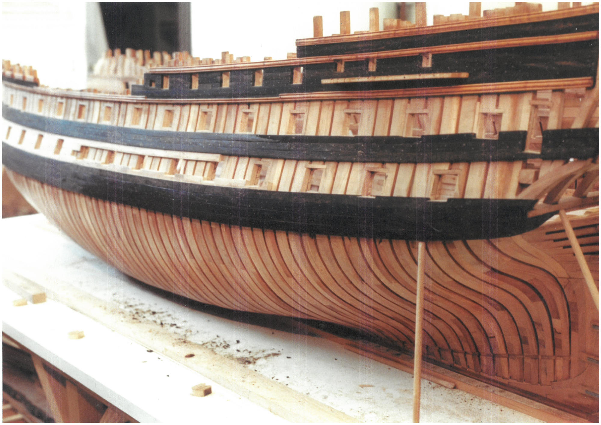 J'ai donc commencé en 1992 après avoir demandé conseil à Jean Boudriot ; Je ne voulais pas construire un modèle déjà existant. Mais il reste peu de documents qui contiennent plans de charpente et décors des sculptures dans la période de la guerre d'Amérique. Les archives ne contiennent que des plans de construction, pas les décors !