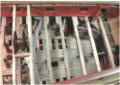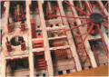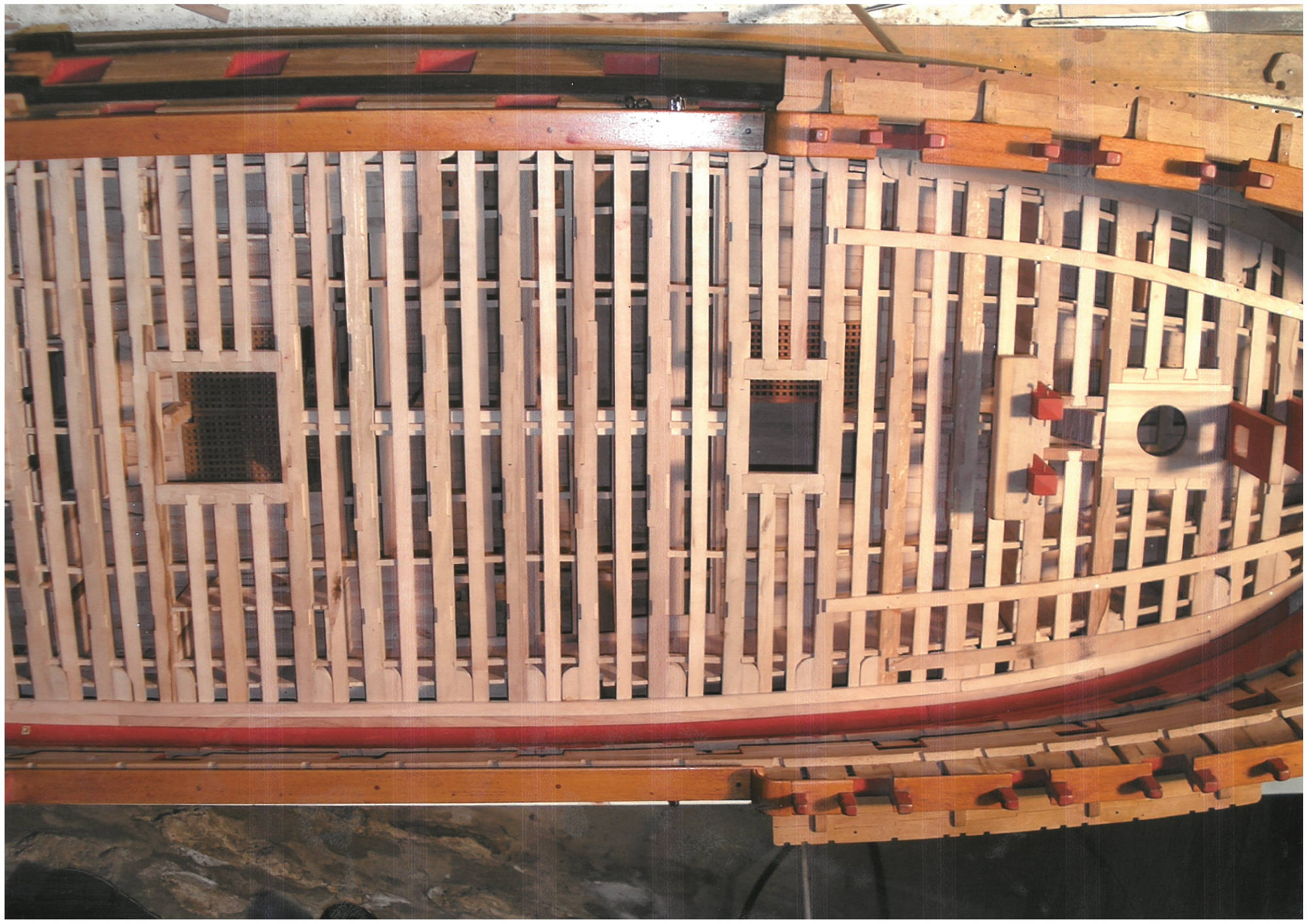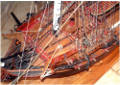 Vous pouvez voir sur les dernières photos que les membrures (les couples) sont apparentes sous la flottaison et que les ponts laissent entrevoir une partie des baux (petit détail : l'extrémité des baux est usinée en queue d'aronde ! Cela vient d'un mot d'époque : l'arondelle en fait de nos jours : l'hirondelle).