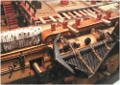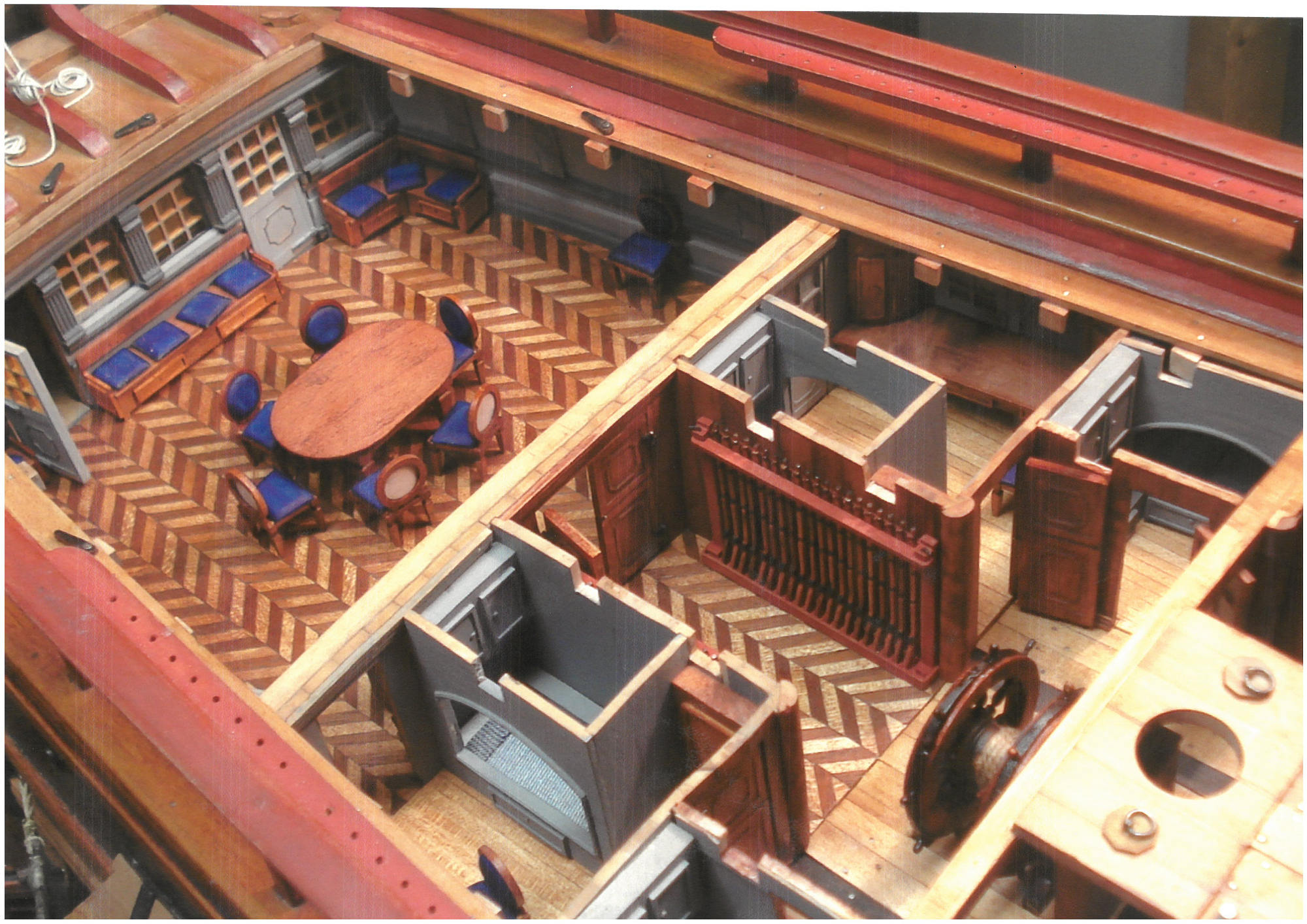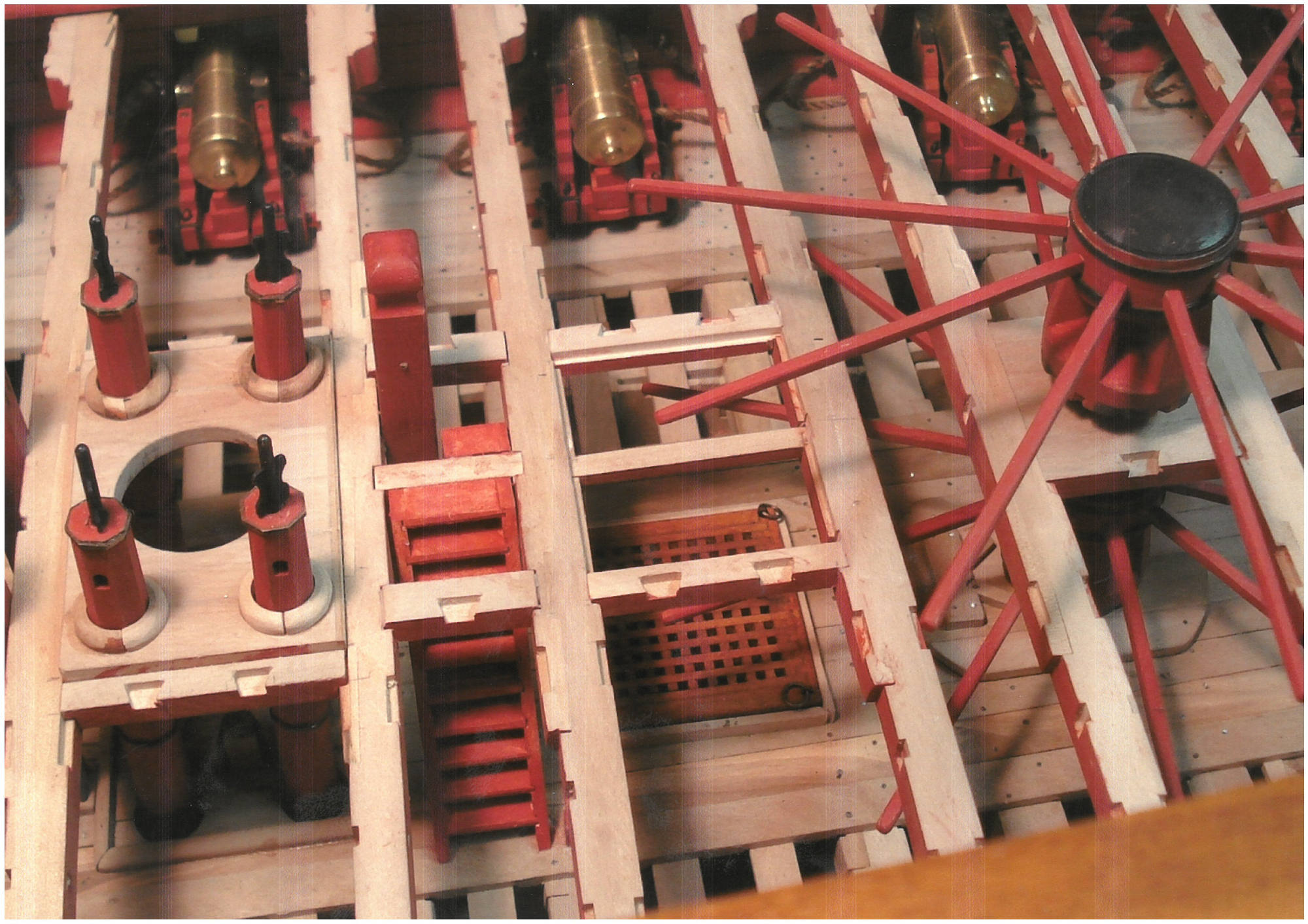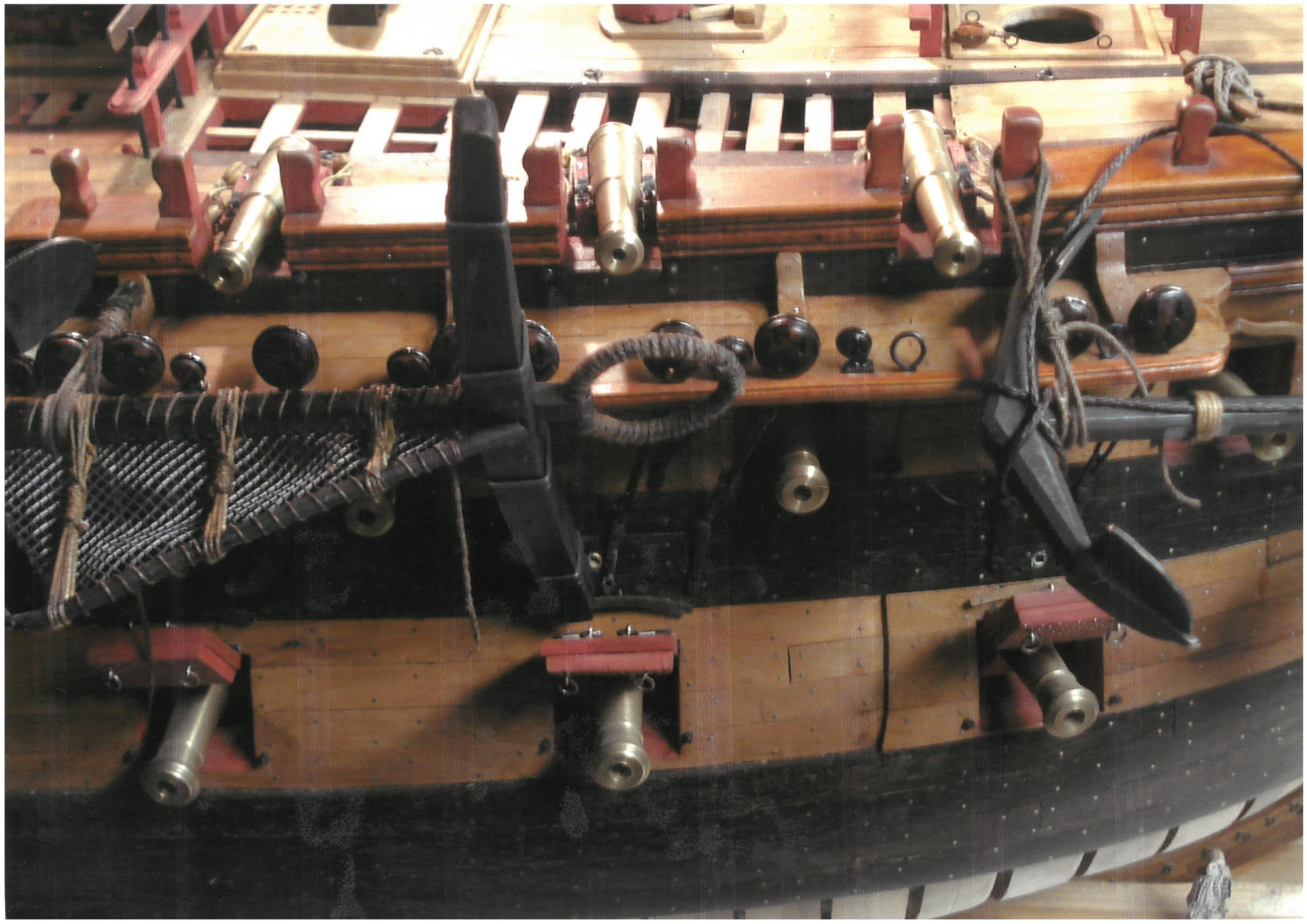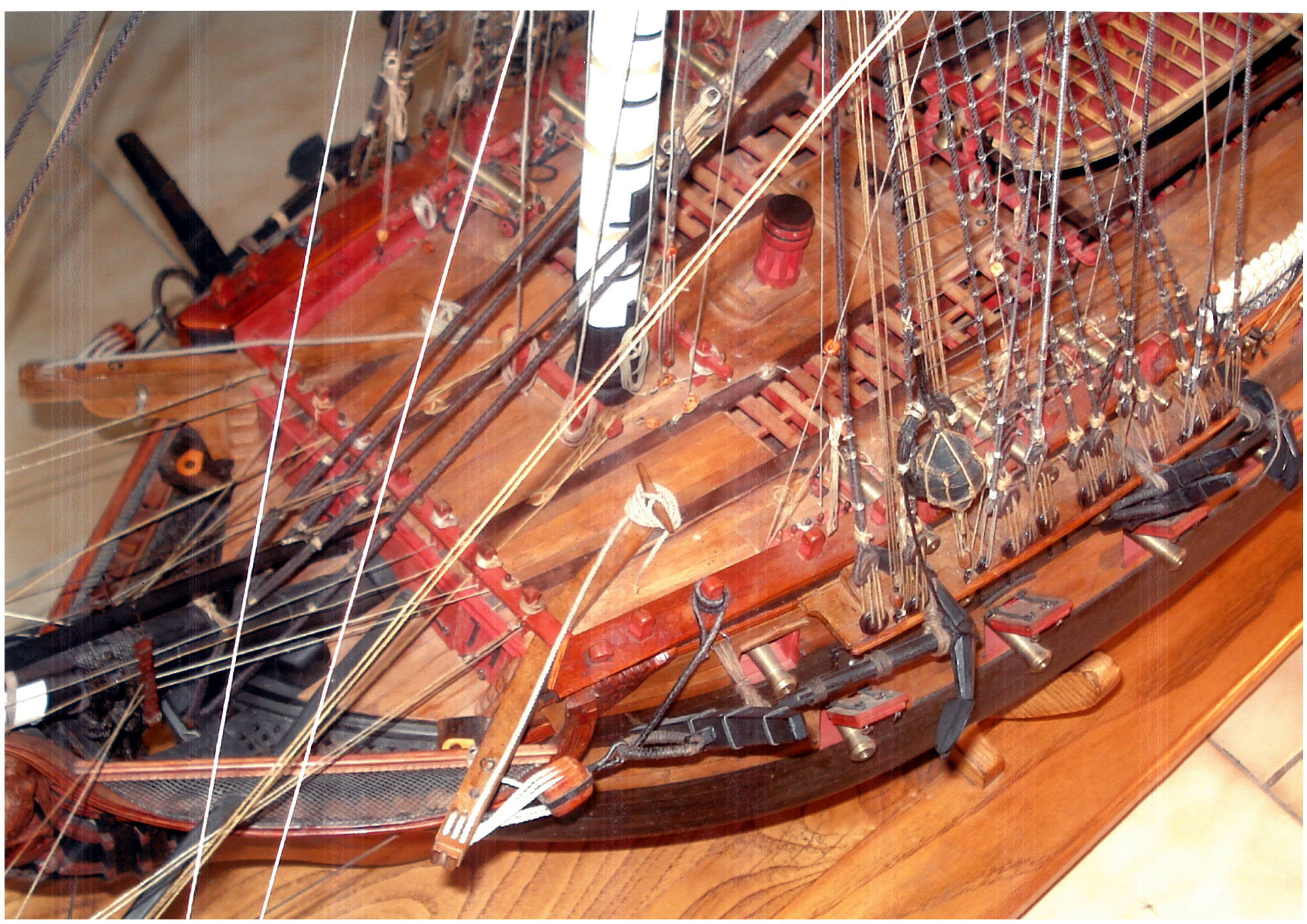 En modélisme d'arsenal, on fabrique tout. Dans l'histoire des arsenaux, les ateliers de modélisme possédaient des équipes qui maîtrisaient chacune leur spécialité et comme je l'ai appris par la suite sur l'Hermione, un tel vaisseau contient à peu près 400 000 pièces (en incluant tous les clous ?), il s'agit de fabriquer à l'échelle ces différentes pièces ! Qu'il s'agisse de la construction des membrures, des différentes poulies ou du commettage des différents cordages dont je vous passe ici les noms ( chaque manœuvre porte un nom différent ). Sur ce modèle la construction des pièces non visibles ont été réalisées (les porques, les cales de bas-mât, les pompes ainsi que cloisons de séparation). On peut en voir sur les photos ; à défaut, l'usage d'un endoscope pourrait montrer ces détails, bien que cette pratique me semble un peu risquée !