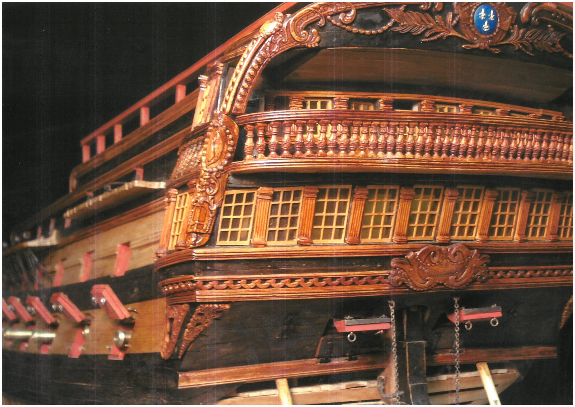 Bref, comme certains modèles de musée construits au XIXe sont en échelle métrique, j'ai pris la décision de travailler au 1/40. Donc pour donner un aperçu de la maquette : longueur de l'étrave à l'étambot : environ 1,38 mètre. Avec l'avancée des poulaines, du mat de beaupré , du bout-dehors et des sculptures de l'arrière : environ 2,20 mètres. La hauteur totale environ 1.60 mètre et la grand vergue environ 74cm. Les bois utilisés sont le poirier, l'ébène et le buis pour les sculptures traités en bois teintés.