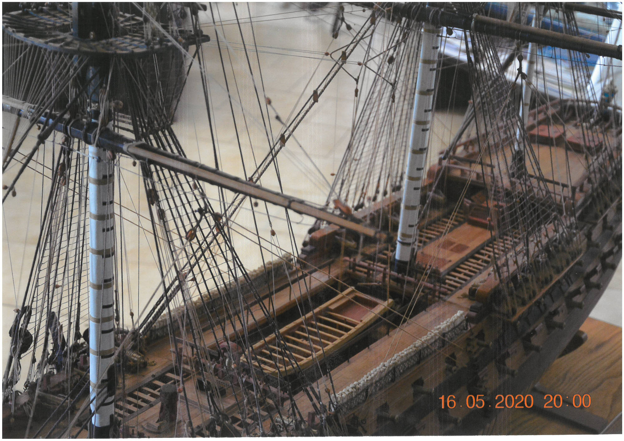 On m'a demandé par courriel, en début d'année si je pouvais le prêter à l'occasion d'une exposition sur Napoléon au musée de l'Armée. Abusé par le nom du vaisseau « Northumberland » ! (en effet, un troisième bâtiment portant ce nom a été construit en Angleterre sur le chantier naval de Deptford en 1798, et c'est ce dernier qui a emmené Napoléon à Sainte-Hélène après 1815) J'ai expliqué que mon modèle n'était pas terminé mais que ce n'était pas le même, près de vingt ans les séparent ! D'autre part si la Marine de guerre française a eu ses heures de gloire au moment de la guerre d'Amérique, le XIXe siècle a été anglais à cause de l'incompréhension napoléonienne sur la nécessité de maîtriser les mers, les combats d'Aboukir et de Trafalgar auront sonné ce triste constat ! J'ajoute que les ordres et contrordres donnés à ses amiraux montraient à quel point l'empereur n'avait aucune politique maritime. De plus certains détails étaient datés et ne pouvaient correspondre à 1815 : les fleurs de lys sur le blason, sculptures symboliques détruites en 1789 et le pavillon blanc ( couleur de la marine royale), le bleu et le rouge, les couleurs de Paris ne seront ajoutées sur le pavillon national qu'après la révolution, dans plusieurs positions différentes inspirées de l'héraldique ! Un vaisseau français de 1815 aurait porté d'autres décors : les symboles de l'empire : aigles , abeilles et papillons ! C'est également le cas de la vergue d'artimon sur la maquette. Dite vergue latine, sa forme est datée, elle sera remplacée à la fin du XVIIIè siècle (vers 1785 ?) par deux espars nommés gui et corne, bloqués en parallèle sur l'arrière du mat d'artimon.